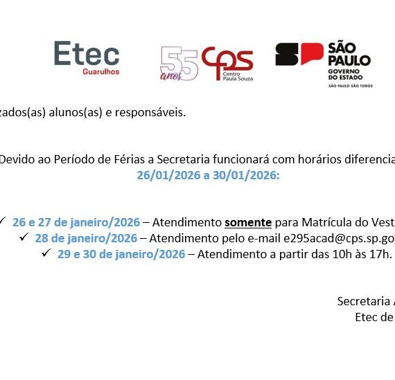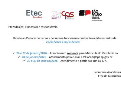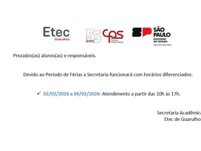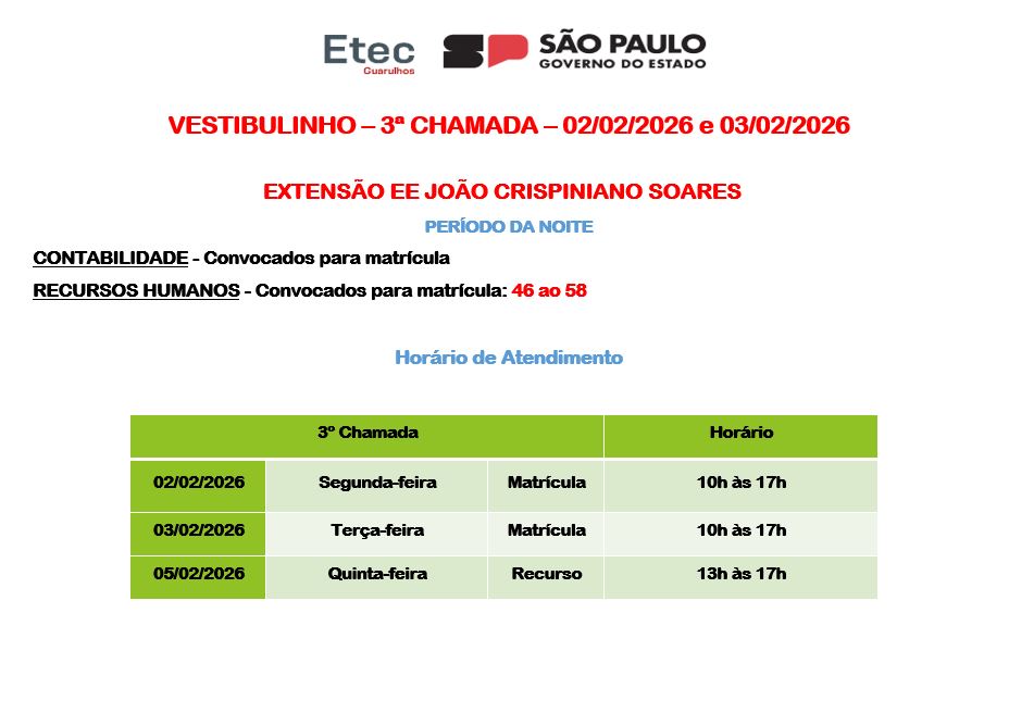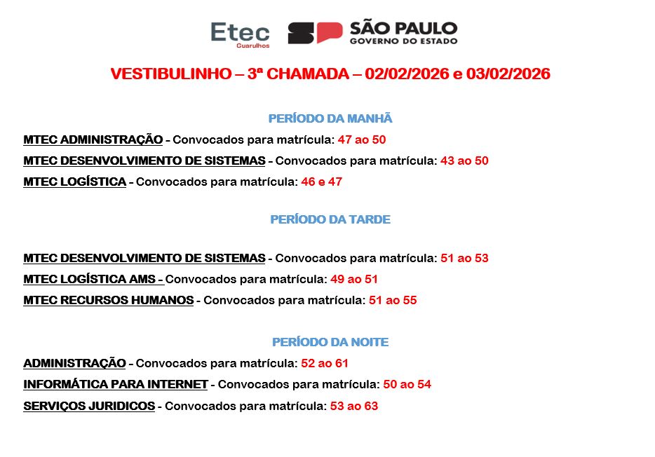 A Etec de Guarulhos informa os dias e horários referentes a terceira chamada dos aprovados no Vestibulinho Etec – 1º Semestre de 2026. Os alunos receberão as informações via e-mail e SMS com os documentos necessários a serem apresentados para a realização da matrícula (a relação também se encontra disponível no Manual do Candidato, a partir da página 23), que será feita presencialmente na Etec de Guarulhos, situada à Rua Cristobal Cláudio Elilo, 88, Parque Cecap, entre os dias 02 e 03 de fevereiro de 2026, das 10 às 19 horas. Os alunos que precisarem corrigir alguma documentação apresentada e/ou perderam o prazo inicial de matrícula, terão o prazo de recurso para efetuar a matrícula exclusivamente no dia 05 de fevereiro de 2026, entre às 13 e 17 horas.