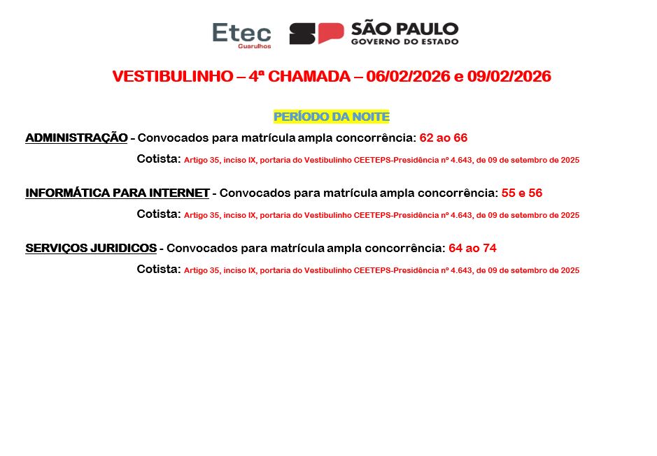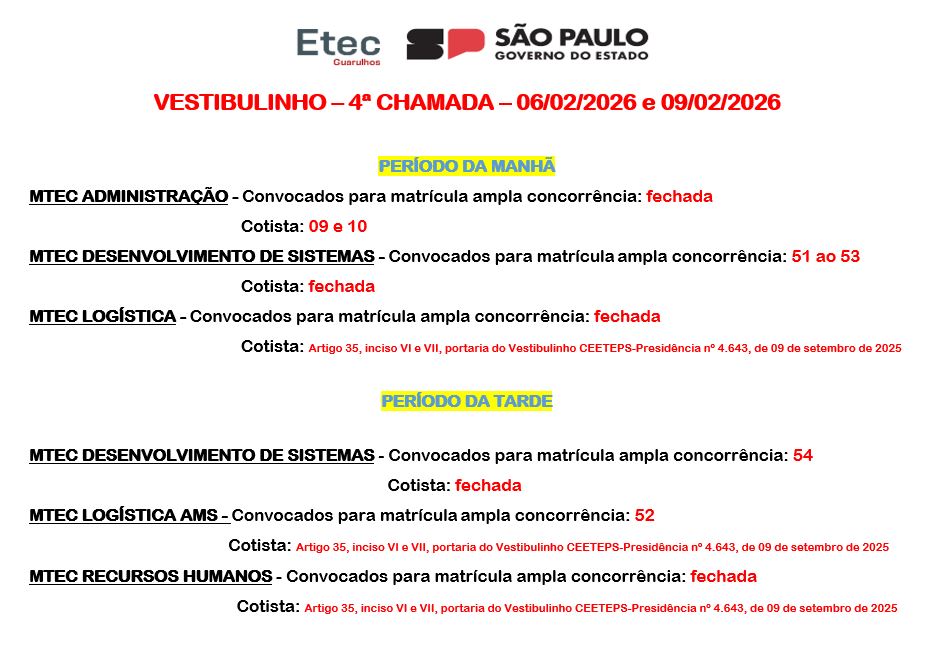 A Etec de Guarulhos informa os dias e horários referentes a quarta chamada dos aprovados no Vestibulinho Etec – 1º Semestre de 2026. Os alunos receberão as informações via e-mail e SMS com os documentos necessários a serem apresentados para a realização da matrícula (a relação também se encontra disponível no Manual do Candidato, a partir da página 23), que será feita presencialmente na Etec de Guarulhos, situada à Rua Cristobal Cláudio Elilo, 88, Parque Cecap, no dia 06 de fevereiro de 2026, das 10 às 17 horas. Os alunos que precisarem corrigir alguma documentação apresentada e/ou perderam o prazo inicial de matrícula, terão o prazo de recurso para efetuar a matrícula exclusivamente no dia 09 de fevereiro de 2026, das 11 as 13:30 horas e das 16 as 17:30 horas.