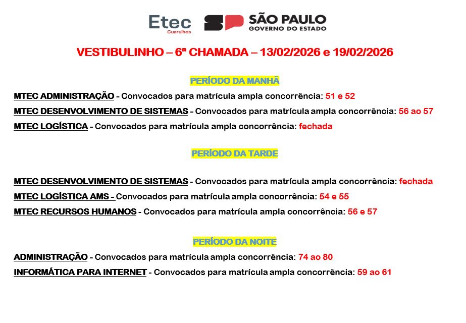 A Etec de Guarulhos informa os dias e horários referentes a sexta chamada dos aprovados no Vestibulinho Etec – 1º Semestre de 2026. Os alunos receberão as informações via e-mail e SMS com os documentos necessários a serem apresentados para a realização da matrícula (a relação também se encontra disponível no Manual do Candidato, a partir da página 23), que será feita presencialmente na Etec de Guarulhos, situada à Rua Cristobal Cláudio Elilo, 88, Parque Cecap, no dia 13 de fevereiro de 2026, das 10 às 13:30 e das 15:30 às 17 horas. Os alunos que precisarem corrigir alguma documentação apresentada e/ou perderam o prazo inicial de matrícula, terão o prazo de recurso para efetuar a matrícula exclusivamente no dia 19 de fevereiro de 2026, das 15:30 às 20 horas.