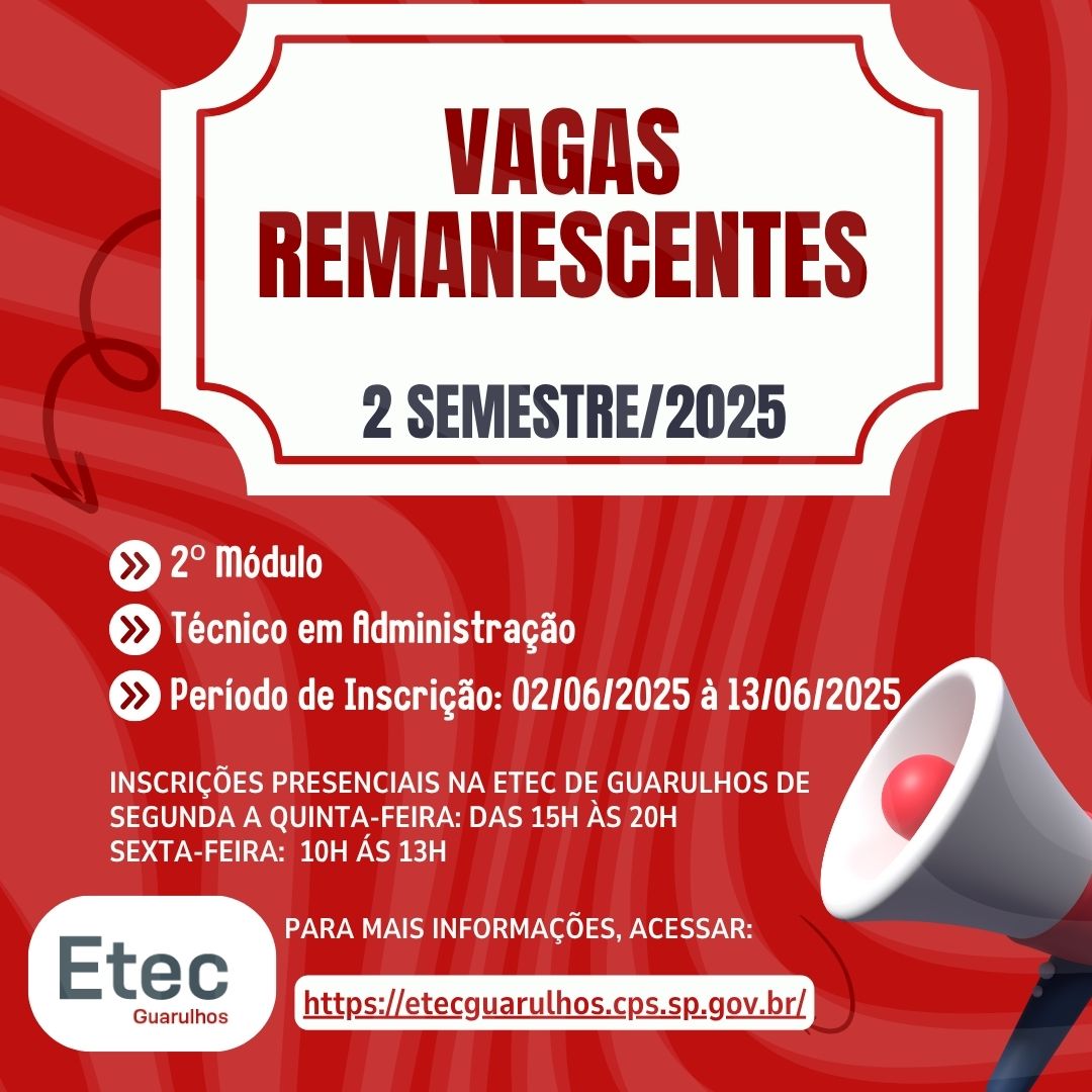 A Etec de Guarulhos abriu um processo para inscrições de vagas remanescentes para o segundo semestre de 2025. O processo envolve vagas para o 2º módulo do curso Técnico em Administração (clique aqui para obter mais informações sobre o curso). As inscrições devem ser feitas presencialmente na Secretaria da Etec entre os dias 02 e 13 de junho de 2025. Segue abaixo os horários de atendimento da Secretaria: